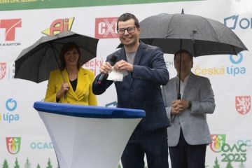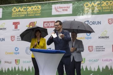 Sakra, začíná pršet. Nemáme kryté pódium. Řečníci říkají, že to bude jen krátké, pozdraví a poděkují. Začíná Leho Haldna, prezident IOF. Jeho pomalejší řeč ale trvá možná pět, možná šest minut. To vše ještě překládají moderátoři do češtiny. Vidím na divácích, že už by nejradši odešli domů. Prší. Nemám u sebe vysílačku, ale naznačuji pořadatelům, aby přinesli děštníky. Než to pochopí, dalších pár desítek vteřin ubíhá. Začíná paní starostka Volfová. I přes původní avizo mluví dlouho. Každou její větu překládá, jak jinak, do angličtiny moderátoři. Nekoukám na hodinky, ale za mě je to věčnost. Lidé čekají na své vítěze, hned po projevech a slavnostním zahájení začíná ceremoniál s oceněním nejlepších běžců dne. Paní starostce držím alespoň deštník a přemýšlím. Musím to aspoň i já zkrátit.