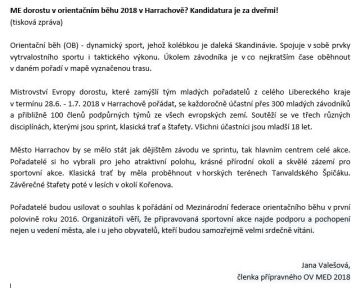"Ahoj, svaz může počítat s kandidaturou na MED 2018. Jednotlivé terény a arény se budou vytipovávat během léta/podzimu, ale jako centrum závodu se nabízí Harrachov. Lesní disciplíny proběhnou do 20 km od centra. Malý organizační tým "kandidatury" bude pracovat ve složení Jana Valešová, Dan Wolf a Honza Picek."